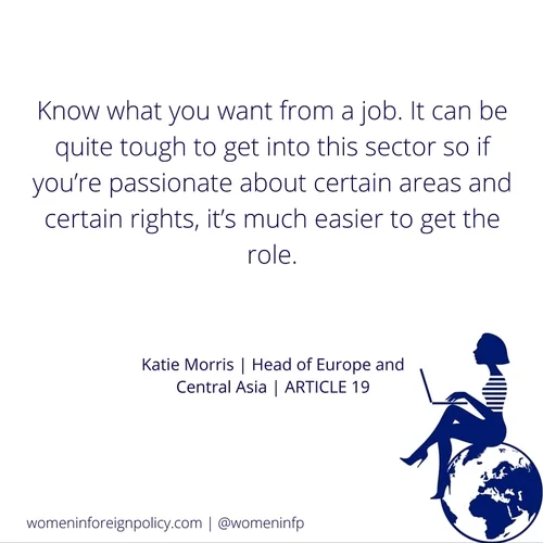 Inspired by Katie's career? Here are some related opportunities: Jobs at Saferworld | Jobs, internships and fellowships at Article 19 | Careers at Chatham House | Fundraising jobs at Listen